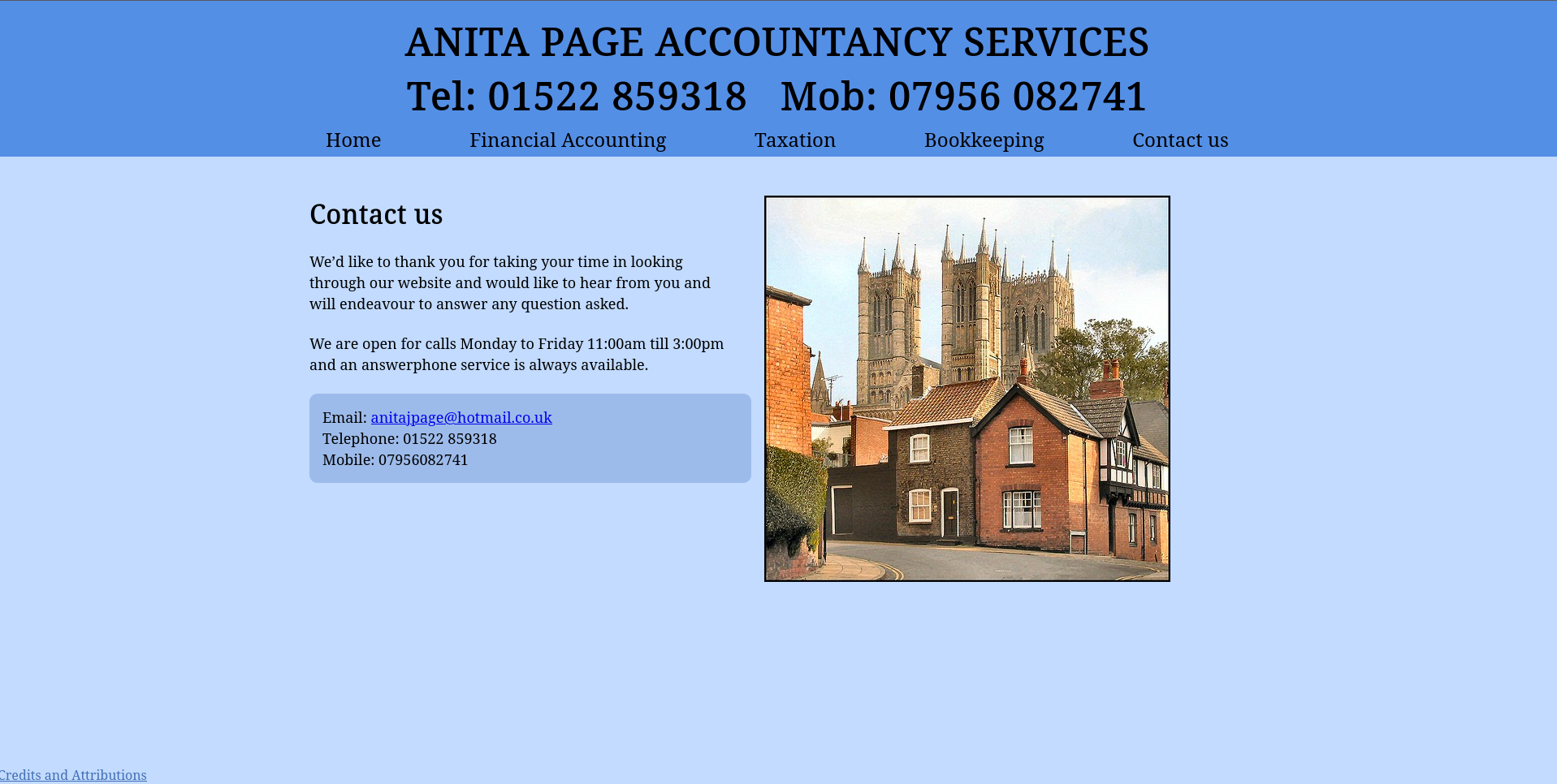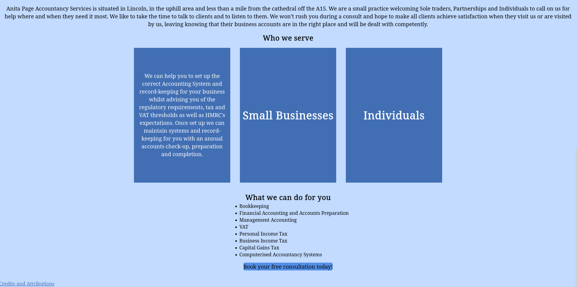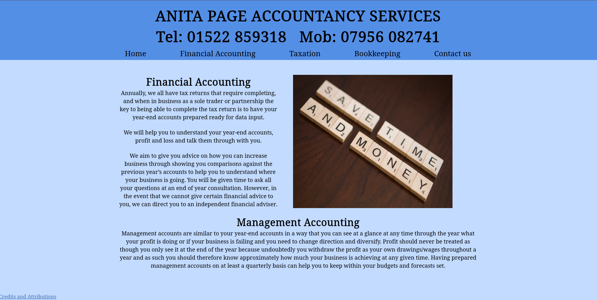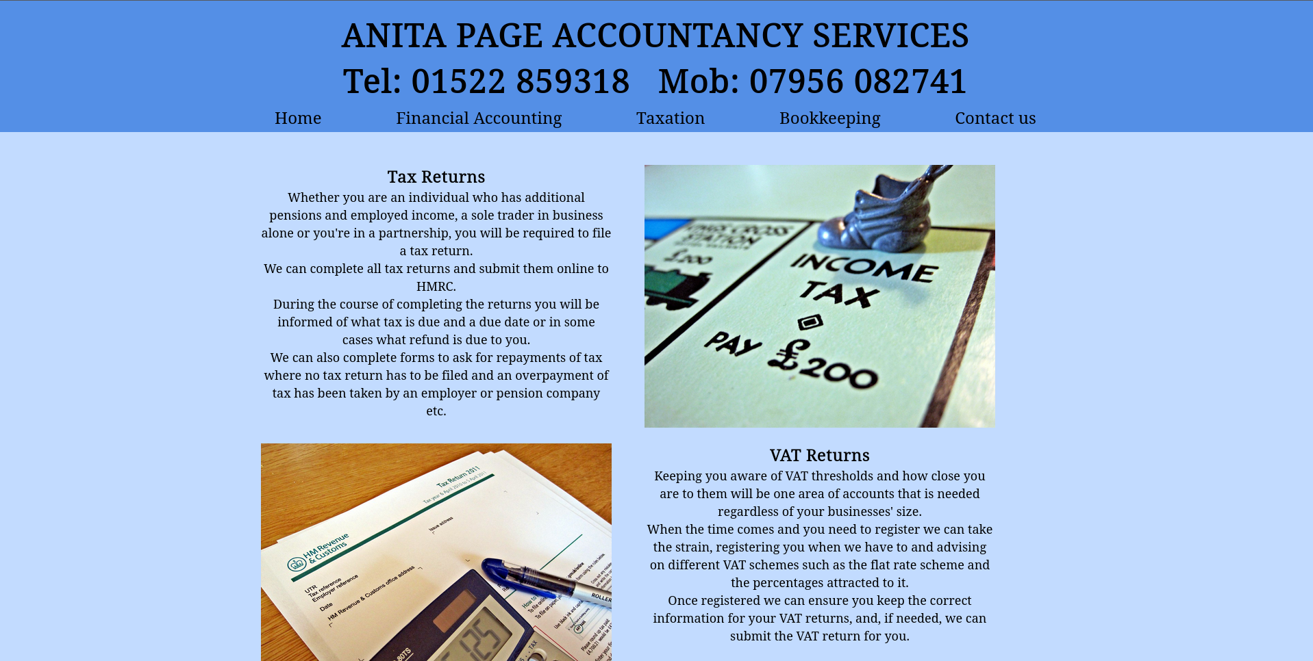 Anita Page Accountancy Services is a website made for a small accountancy firm based in Lincoln, on commission. The website consists of various pages, including a contact page and information on the firms services.